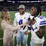 ARLINGTON, TEXAS - NOVEMBER 12: CeeDee Lamb #88 of the Dallas Cowboys and Dak Prescott #4 of the Dallas Cowboys are interviewed by Erin Andrews after the game against the New York Giants at AT&T Stadium on November 12, 2023 in Arlington, Texas. (Photo by Sam Hodde/Getty Images)Sam Hodde/Getty Images FOX sideline reporter Erin … [Read more...] about Erin Andrews Can’t Wait For Sunday’s Cowboys-Packers Game