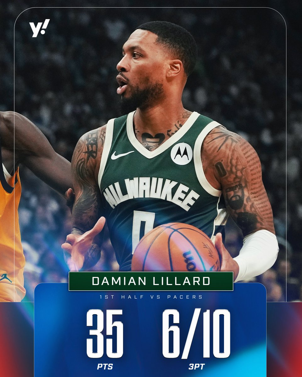 Jamal Collier: Damian Lillard’s 35-point first half carried the Bucks to a 109-94 Game 1 victory over the Pacers He becomes the first player to score 35 points, all in the first half, since tracking data became available per @ESPNStatsInfo -via Twitter @JamalCollier / April 21, 2024