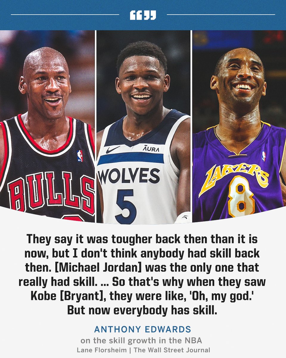 How do you think your generation of basketball is different from older generations? Anthony Edwards: I didn’t watch it back in the day so I can’t speak on it. They say it was tougher back then than it is now, but I don’t think anybody had skill back then. [Michael Jordan] was the only one that really had skill, you know what I mean? So that’s why when they saw Kobe [Bryant], they were like, “Oh, my God.” But now everybody has skill. -via Wall Street Journal / August 20, 2024
