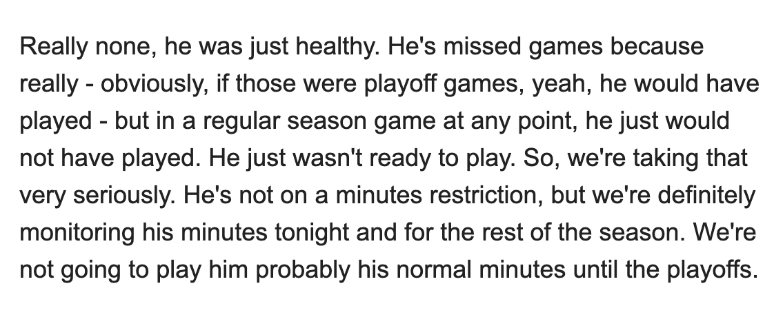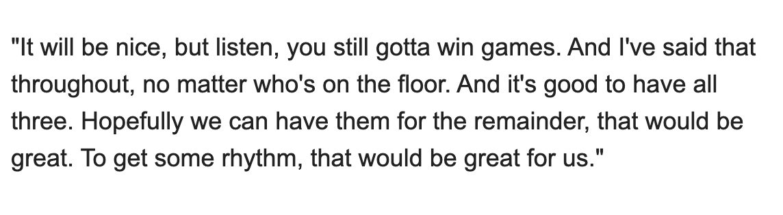 Doc Rivers, on having the big 3 back together tonight: pic.twitter.com/sdE2o8YYWx – 6:06 PM