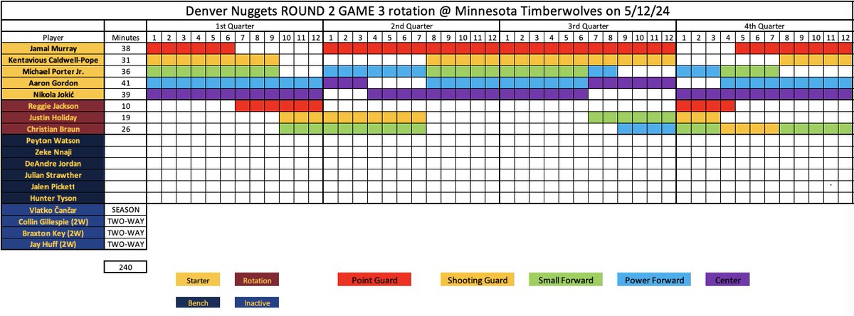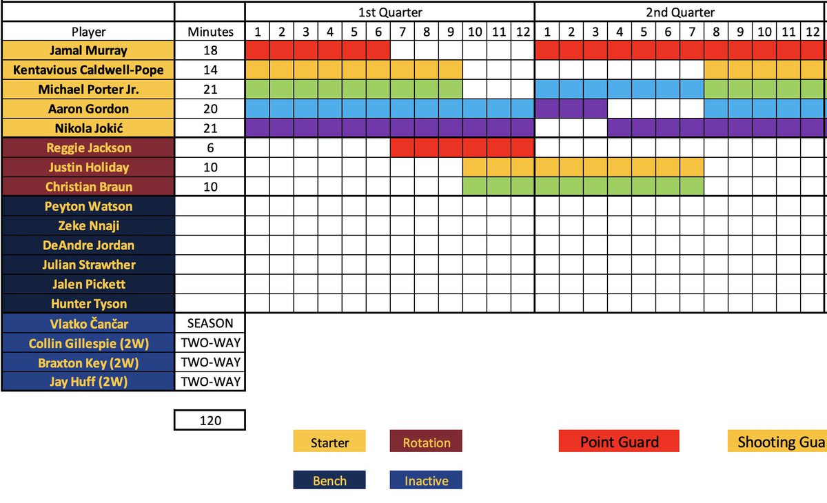 Halftime Rotations for the Nuggets as they lead the T’Wolves 64-49.