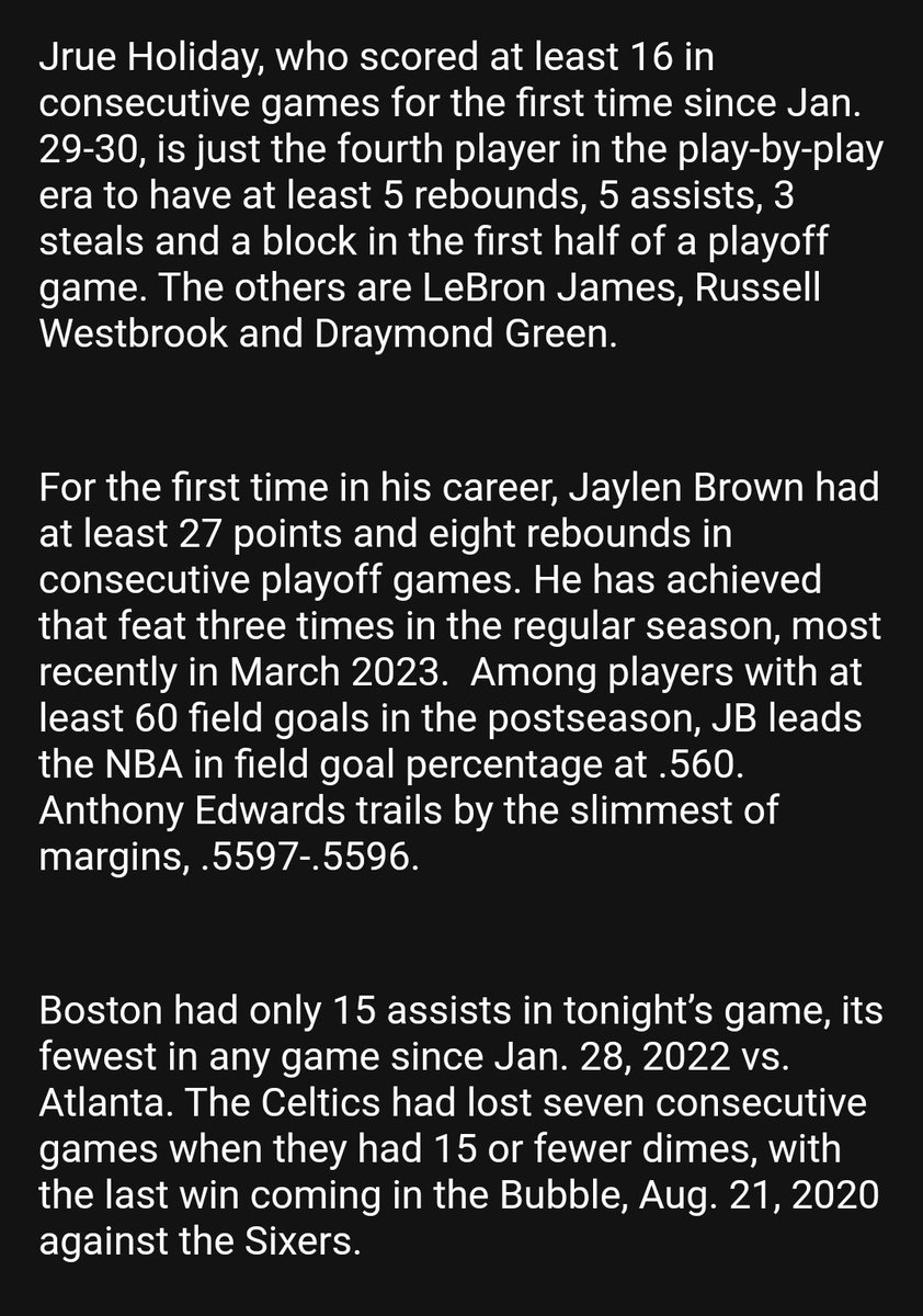 Jorge Sierra: Jaylen Brown (age 27) passed Allen Iverson, Giannis Antetokounmpo and Nikola Jokic in playoff scoring yesterday. He’s No. 56 all-time now. Al Horford is No. 53 (moved ahead of Gary Payton) and Jayson Tatum is No. 44 (passed Byron Scott and John Stockton).