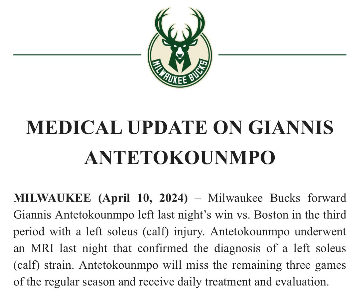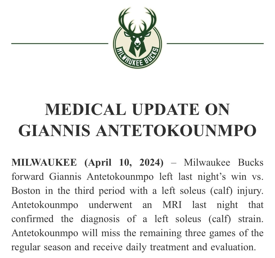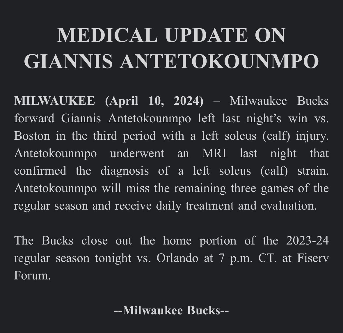 Bucks announce Giannis Antetokounmpo is dealing with a left soleus (calf) injury and will miss the remaining three games of the regular season and receive daily treatment and evaluation. – 5:49 PM