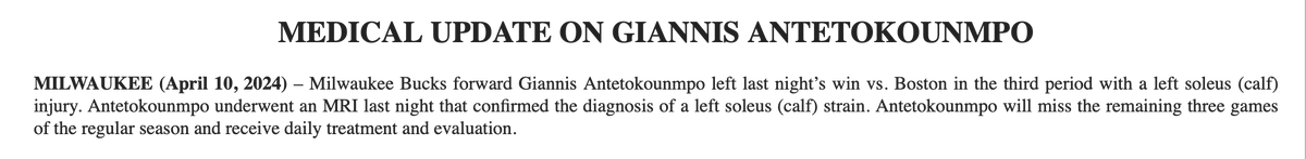 Milwaukee Bucks say Giannis Antetokounmpo (left soleus (calf) strain) will miss the remaining three games of the regular season. – 5:48 PM