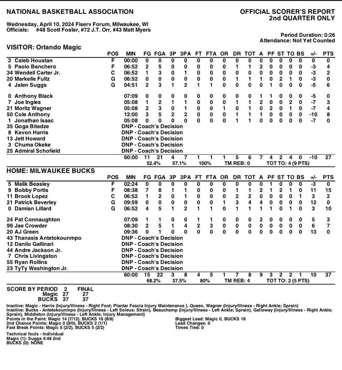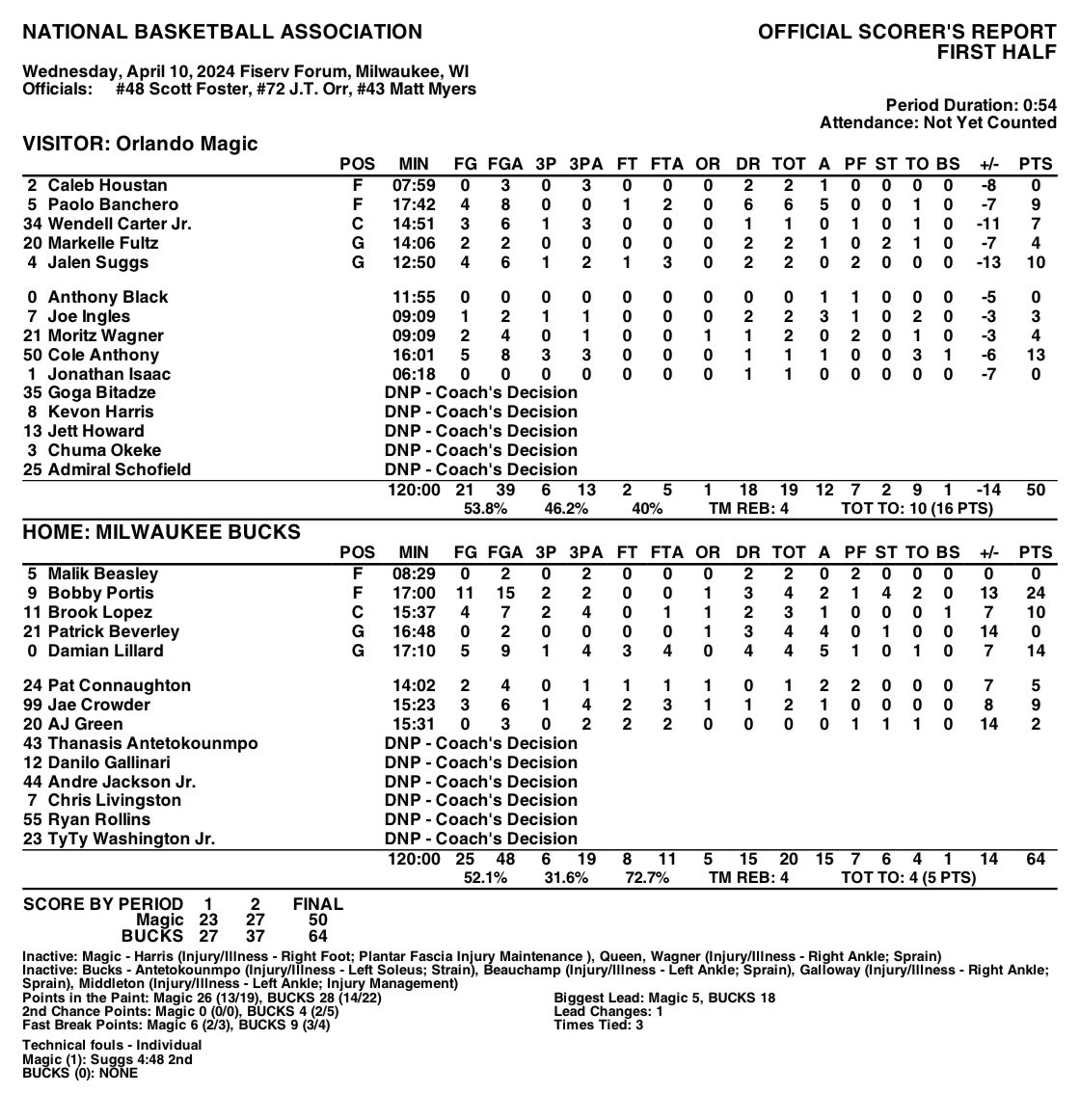 Orlando Magic 50, Milwaukee Bucks 64 (Half)