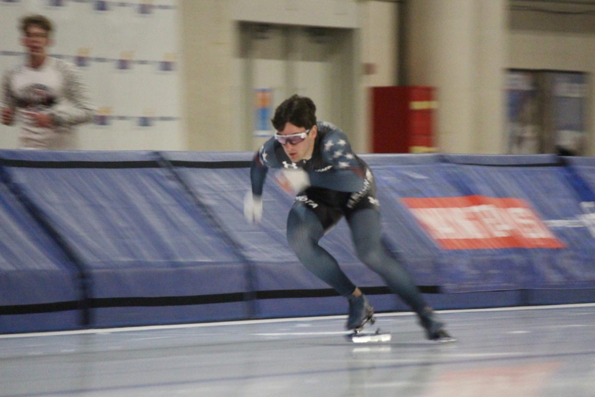 When he practices his starts, he breaks into a full sprint, pumping his arms while in a deep bow. The noise of each blade being pushed to the side and into the ice to propel him forward echo throughout the building. At full speed on the track, he appears around one corner, entering the straight and before he can take four breaths, he has travelled 100 meters and is diving into the next.