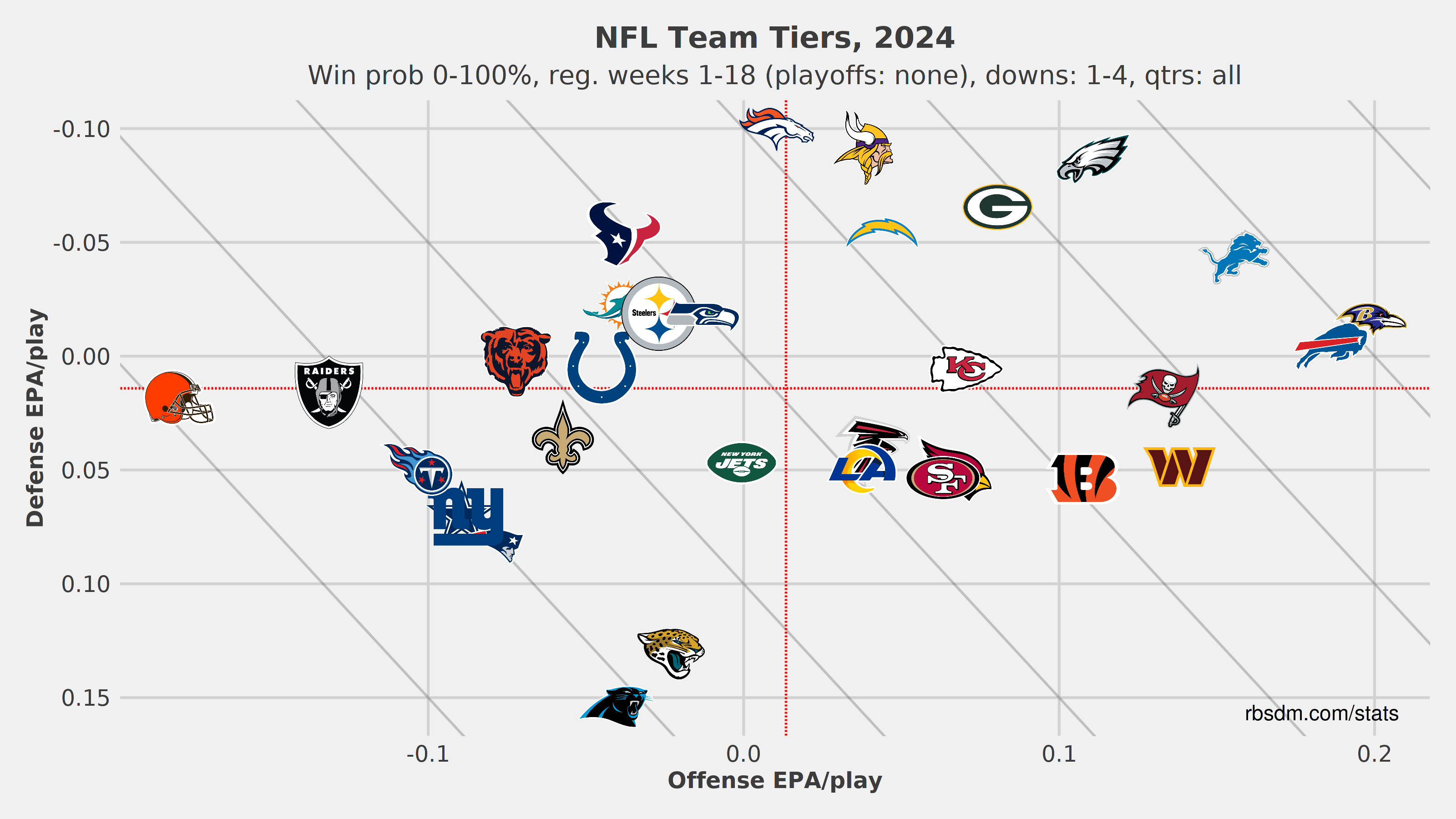 By EPA per play, or expected points added per play, the Packers exist in the upper right quadrant of the team tiers — meaning they are among the best on both offense and defense after 18 weeks. The Packers rank eighth in EPA per play on offense and fourth in EPA per play on defense.